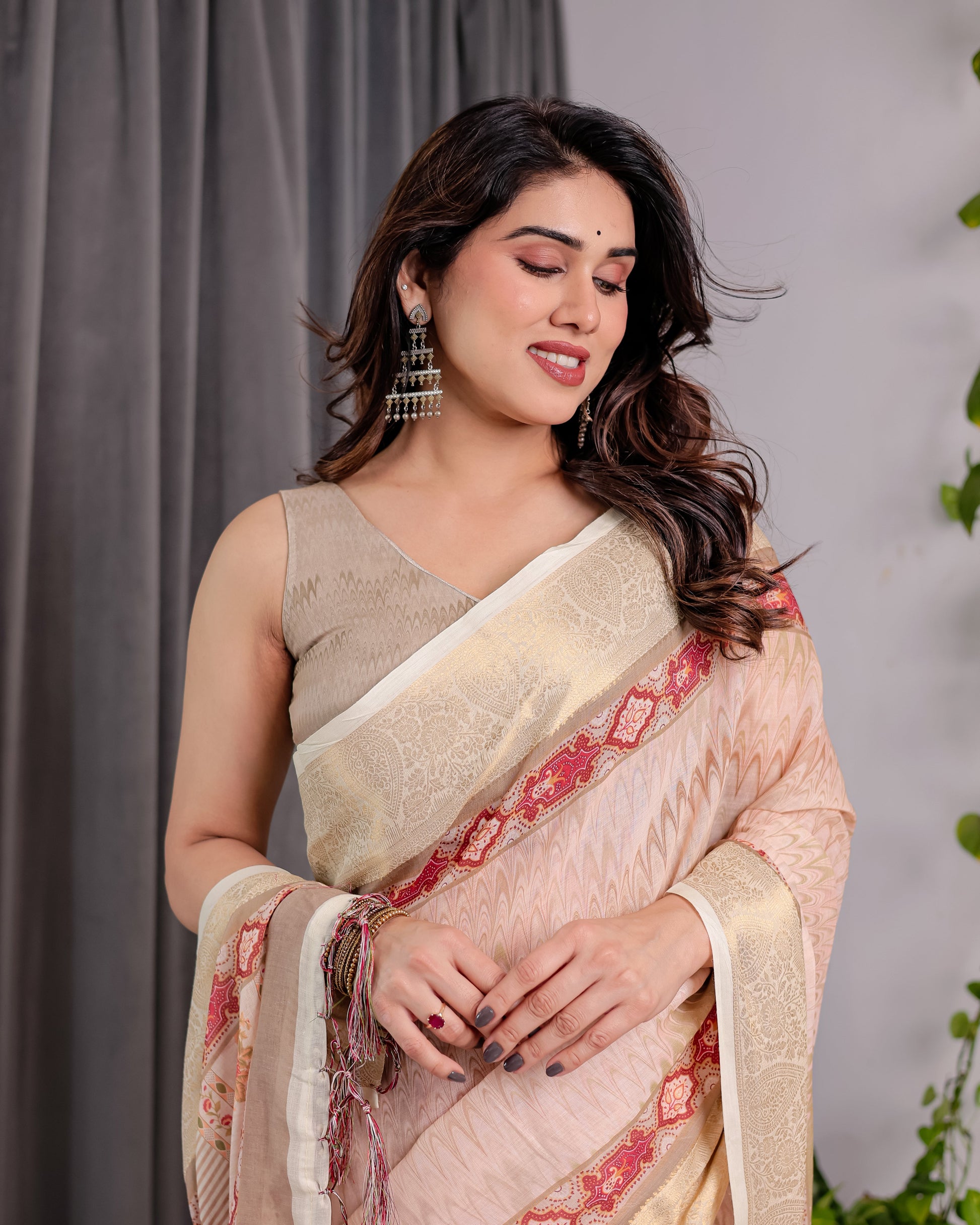 Blush Beige Handloom Linen Saree with Zigzag Weave & Floral Pallu | Zari Border & Tassels | 5.5m Saree + 0.8m Blouse