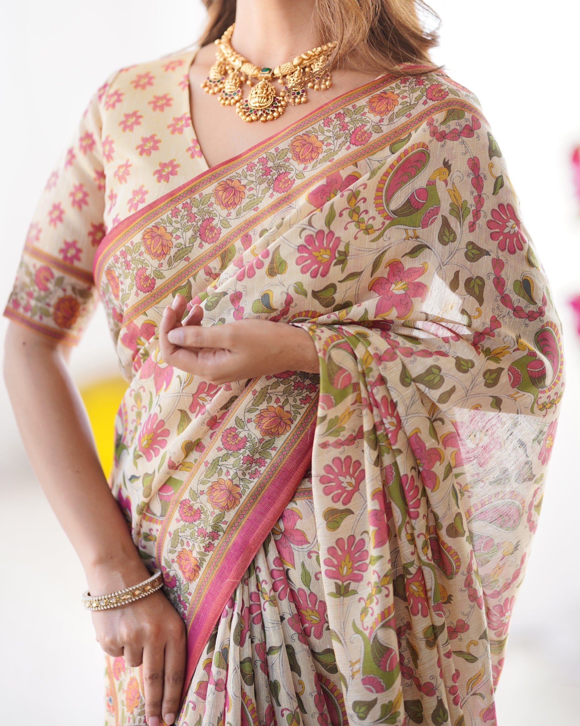 Grace your ethnic wardrobe with the poetic charm of this handloom linen cotton saree, a delicate blend of heritage art and contemporary sophistication. Crafted on a subtle cream-hued base, the saree blooms with vibrant pink floral motifs, enhanced by leafy green vines and soft yellow accents that weave a story of springtime elegance.