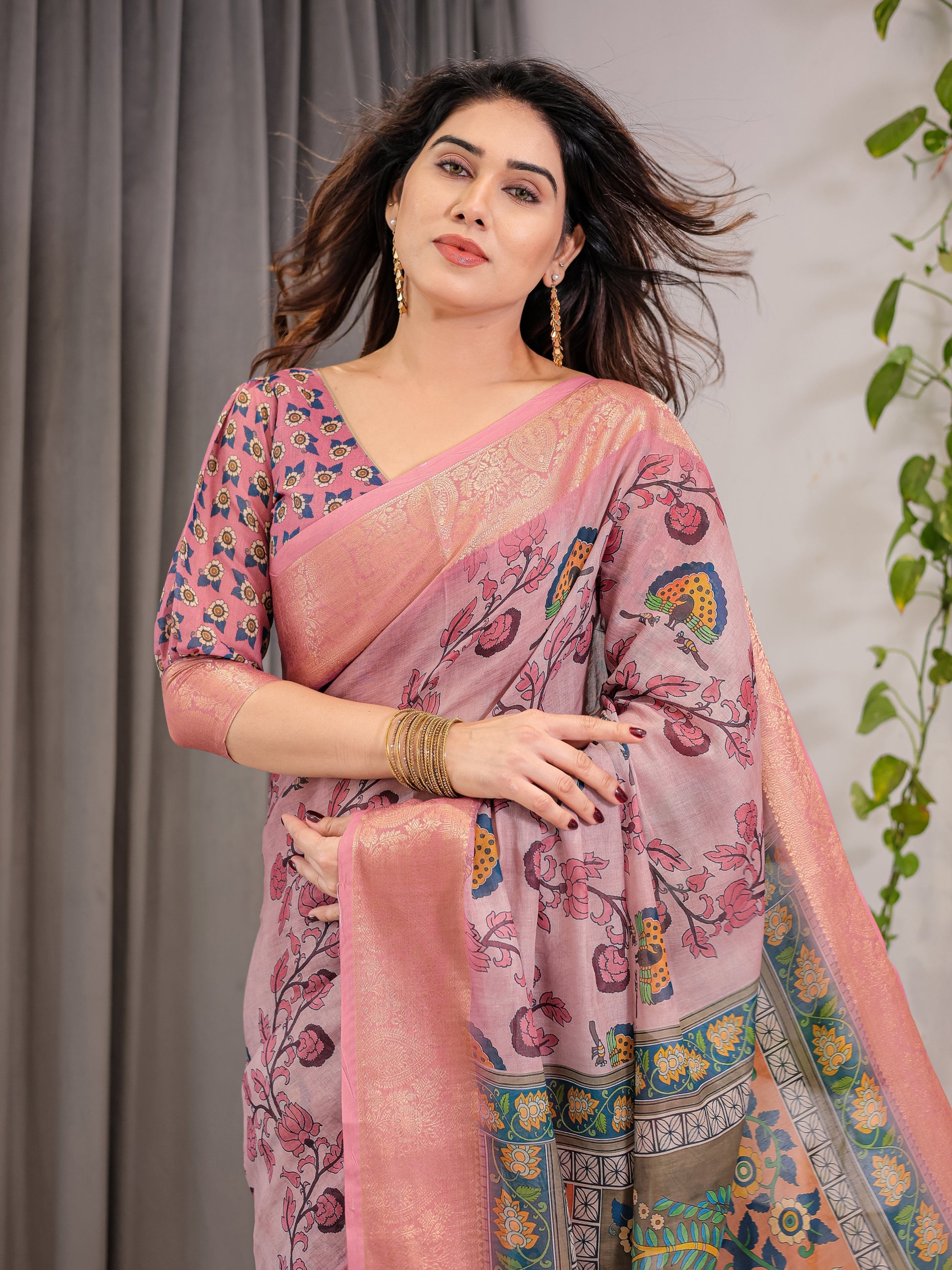 Let grace unfold with every drape in this beautiful dusty rose cotton linen saree, adorned with floral vines and peacock-inspired motifs. The subtle yet striking design is brought to life through a fine blend of rose pink and golden zari borders, lending the saree a regal shimmer perfect for celebratory wear.