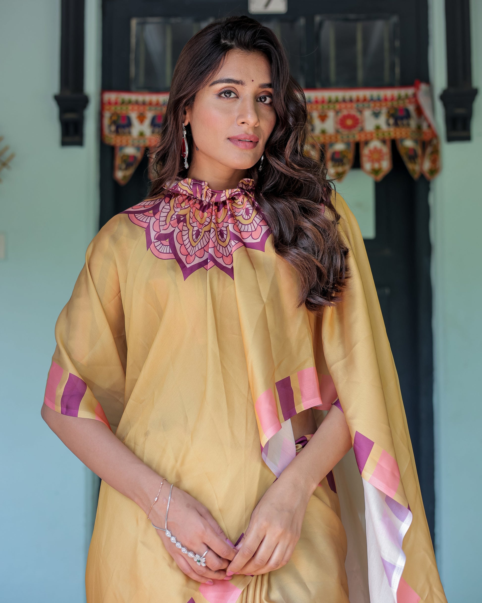 Golden Beige Freehand Designer Saree with Pink Mandala Motif & Striped Blouse | Satin Georgette | Handsfree Pallu