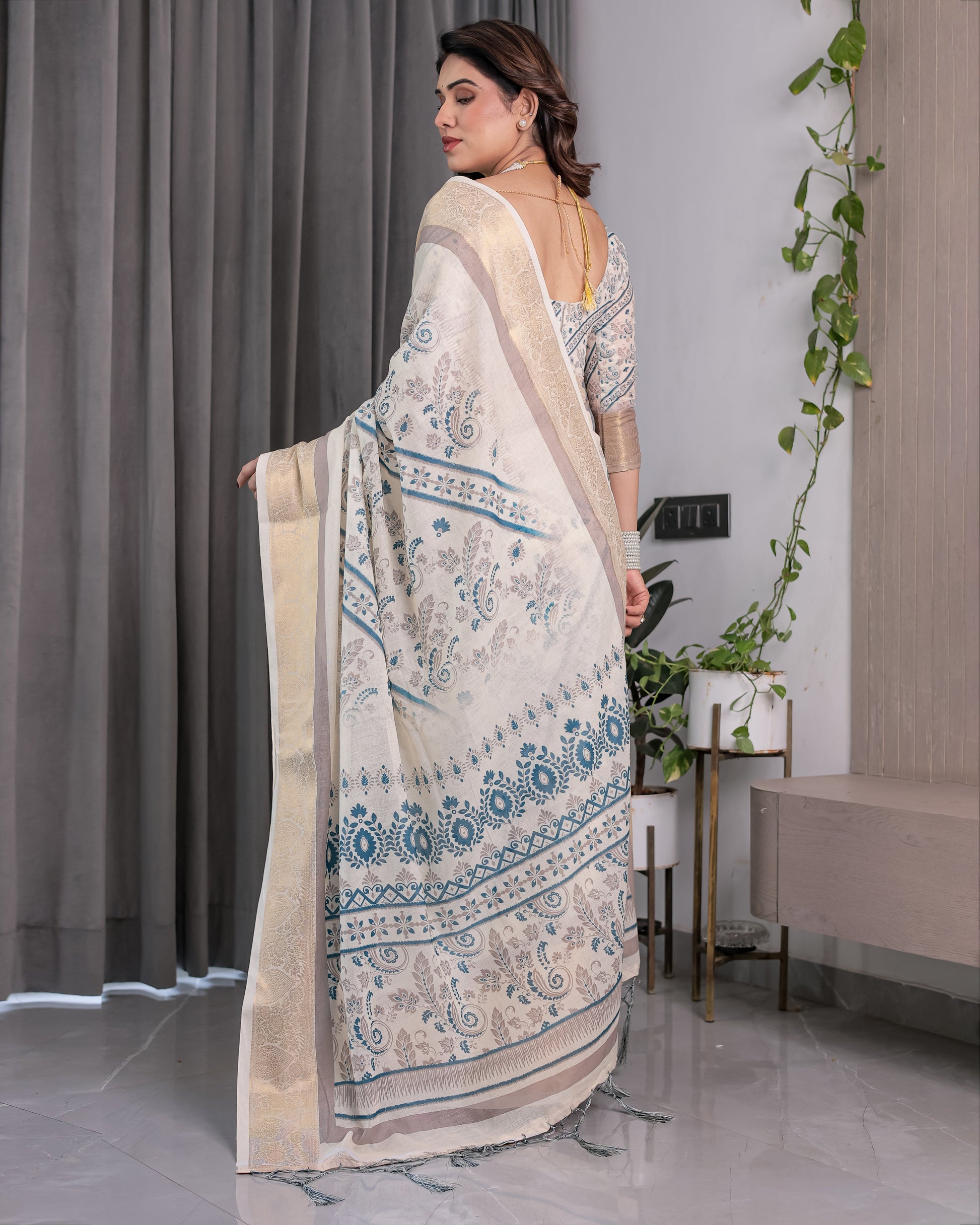 Ivory Beige Handloom Linen Saree with Teal Floral Buta & Paisley Border | Elegant Ethnic Printed Pallu & Zari Highlights | 5.5m Saree + 0.8m Blouse