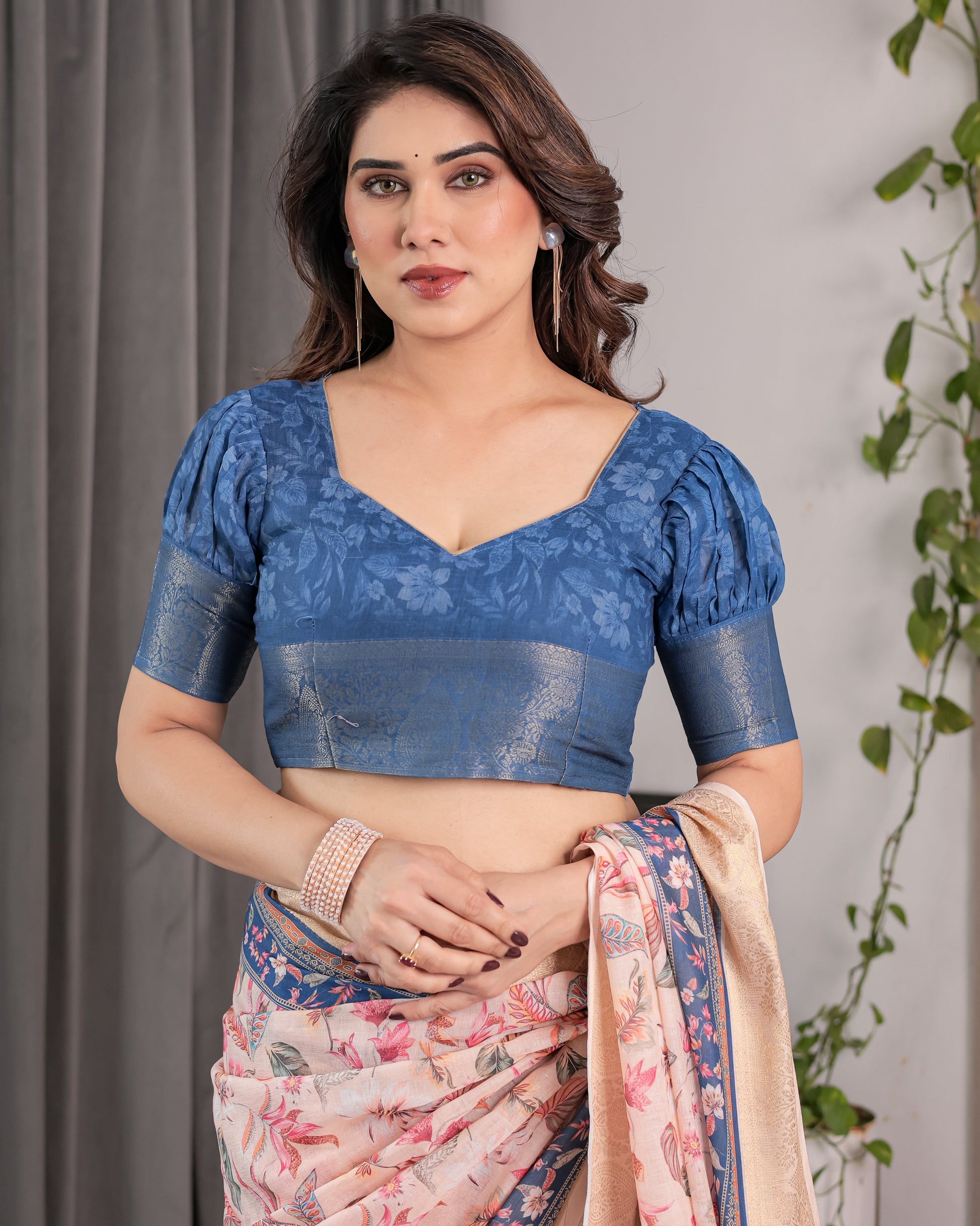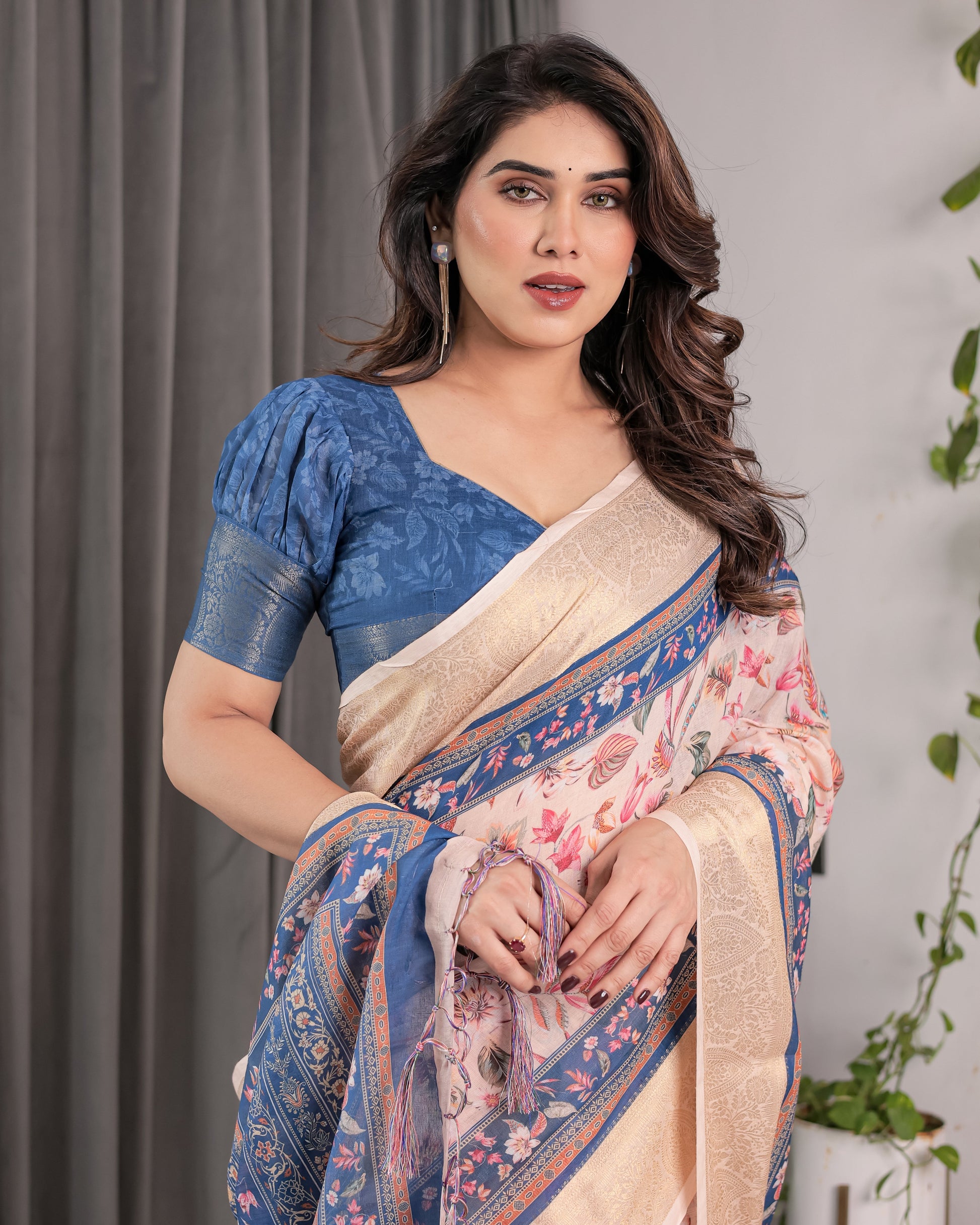 Step into effortless elegance with our Ivory Pink Handloom Linen Saree, featuring a serene botanical print on a soft pastel base and a rich navy blue pallu blooming with traditional floral artistry. A harmonious blend of contemporary finesse and cultural storytelling, this saree is a timeless addition to every saree lover’s wardrobe.