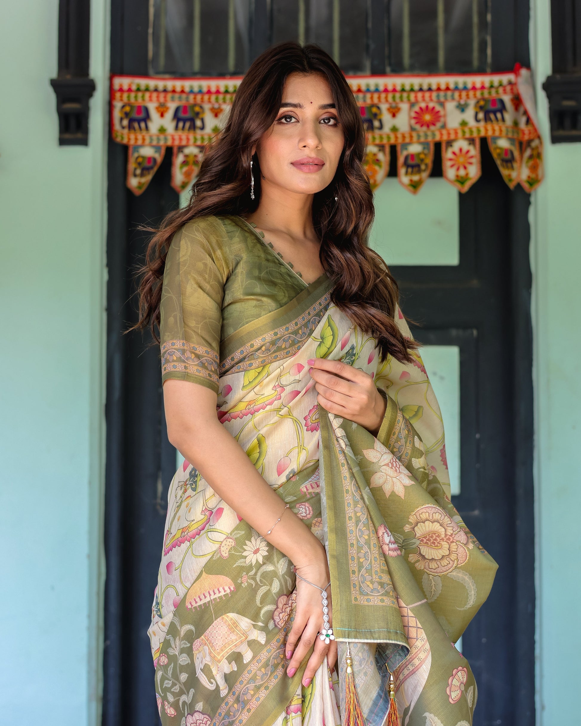Unveil a poetic tale of heritage and serenity with this Olive Green & Ivory Handloom Cotton Saree — a delicate canvas of blooming lotuses and ceremonial elephants that transports you to the grandeur of temple gardens and royal processions.