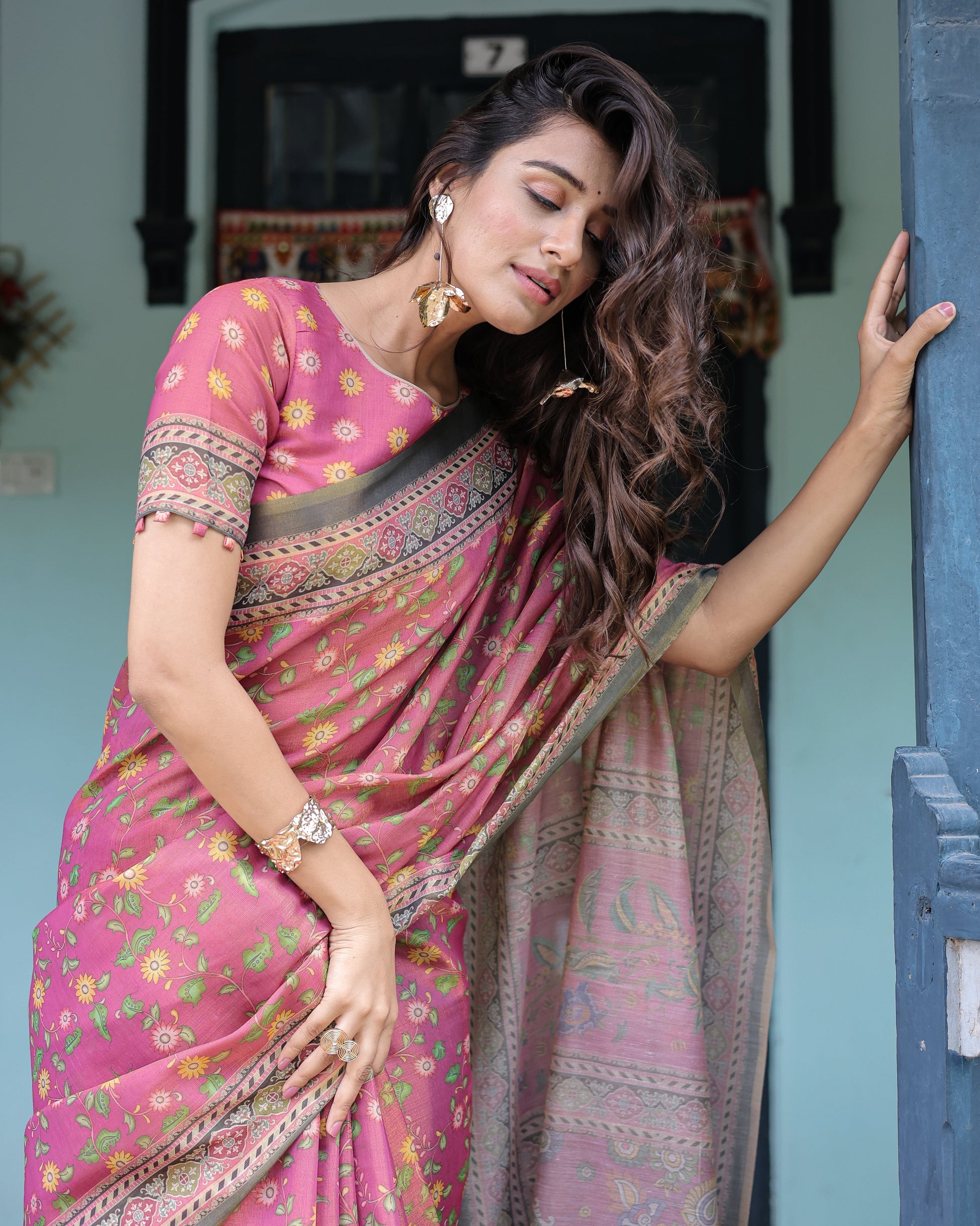 Infuse your festive wardrobe with timeless vibrancy in this Rani Pink Handloom Cotton Saree, a striking blend of blooming elegance and regal storytelling. The body is adorned with sun-kissed yellow floral vines and leafy green motifs that dance across the rich pink base, creating a joyful and feminine aura.