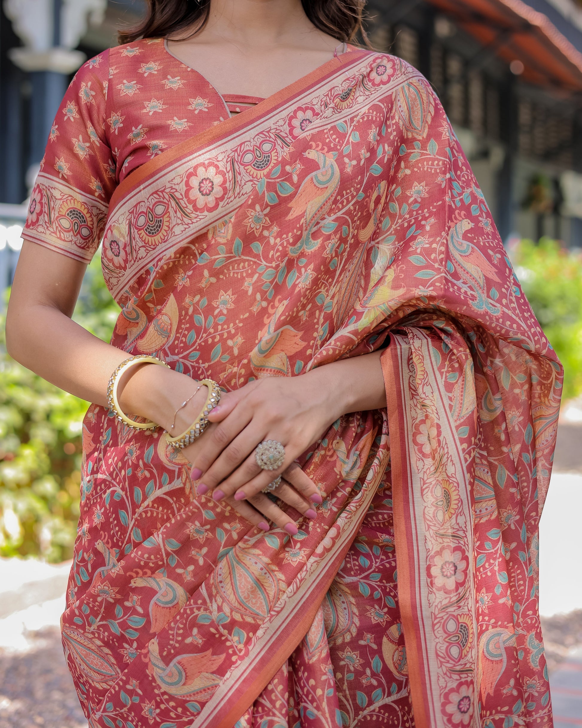 Celebrate culture with color in this Rust Red Handloom Cotton Saree, where tradition meets detailed storytelling. The body of the saree features intricate digital floral vines and birds in delicate beige and turquoise, evoking a classic folk art aesthetic.