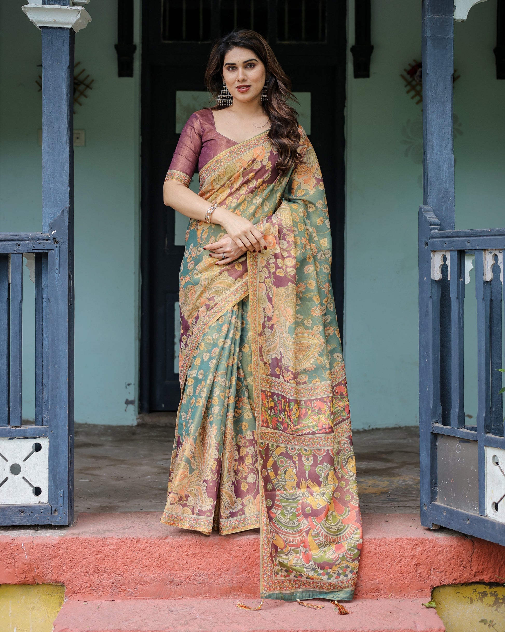 Step into the world of vibrant tradition and rich storytelling with our Sage Green & Maroon Pure Handloom Cotton Saree, beautifully adorned with intricate digital prints. The saree features a unique fusion of traditional tribal artwork and blossoming floral vines that flow seamlessly across the body, offering a timeless ethnic appeal.