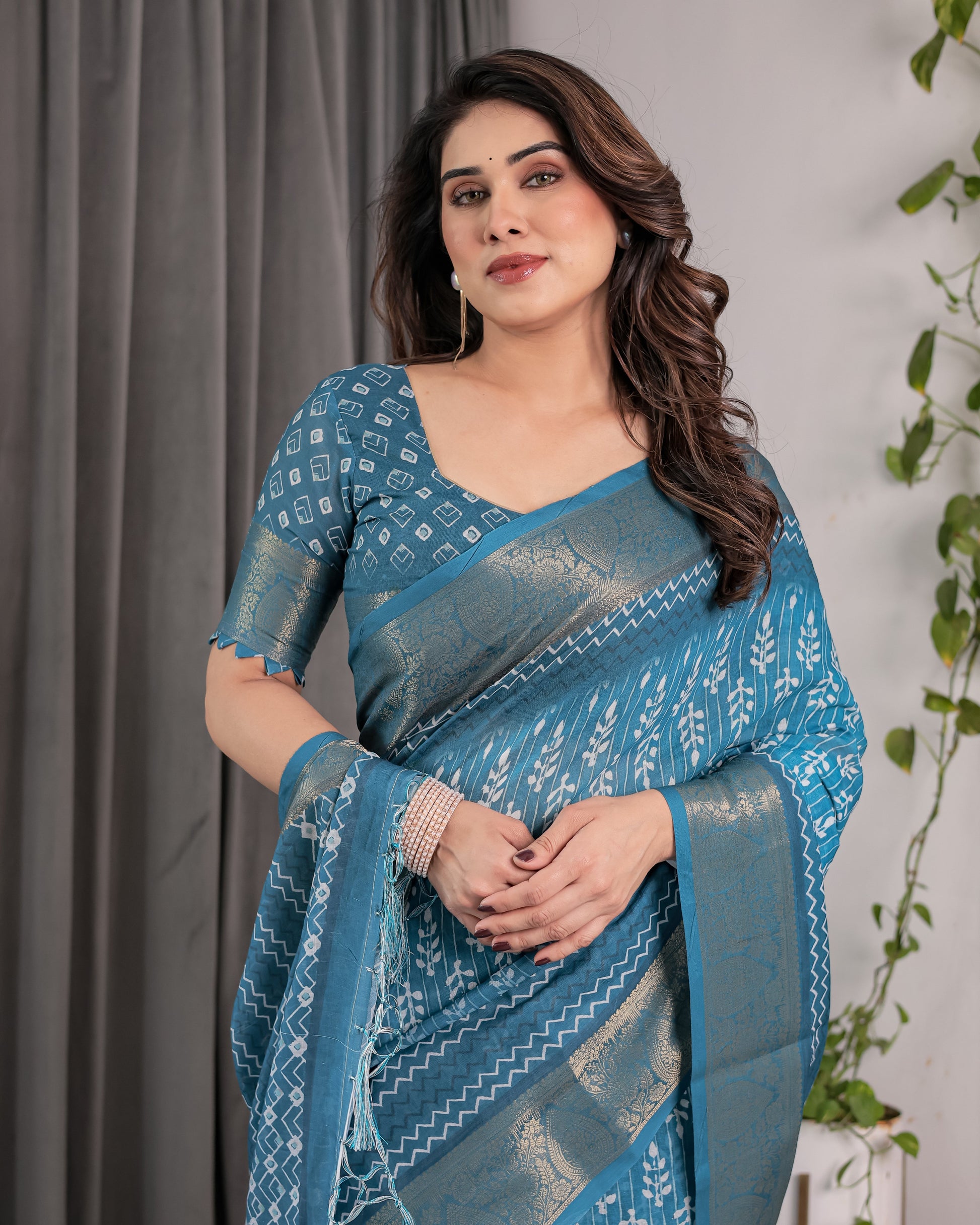 Aqua Blue Pure Cotton Linen Saree with Floral Design, Blouse, and Tassel Detailing