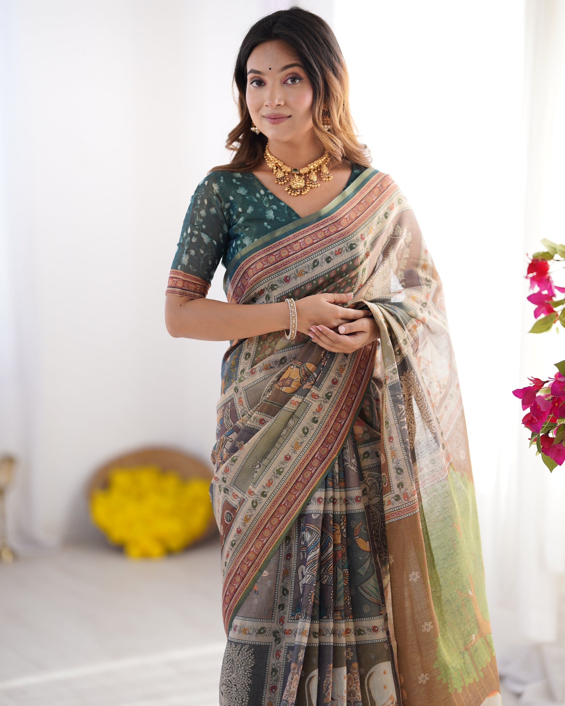 Teal Green & Brown Pure Linen Cotton Handloom Saree with Royal Cow & Tree Motif Pallu